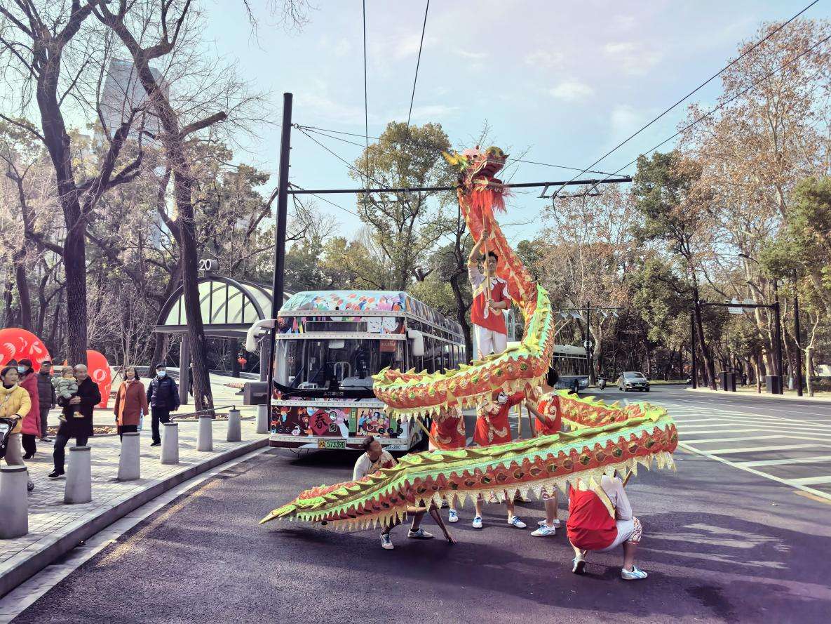 当天,金山区文旅局还在20路中山公园站台为市民准备了丰富有趣的活动。热闹的舞龙表演、糖葫芦制作摊、农民画及剪纸现场创作等让现场仿若迷你小庙会,吸引了乘客纷纷驻足,多位外国友人也饶有兴致地参与进来。不少乘客还收到金山阿婆娘赠送香气扑鼻的米糕,非物质文化遗传代表性传承人赠送的农民画等充满年味的礼物。